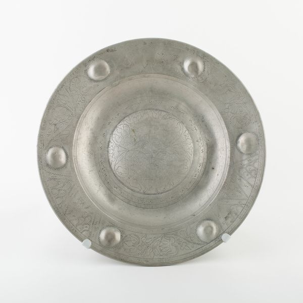 Editor: So this is a ceramic plate, "Plate with the coat of arms of Engel de Ruyter," made sometime between 1661 and 1683. It seems unassuming at first glance – almost dark and earthy. What strikes you about this piece? Curator: The materiality here is everything. Look closely at the stoneware: it isn't about illusionism. It’s about the inherent qualities of the clay, the labor involved in shaping and firing it. That coat of arms pressed into the surface... it speaks to the rising merchant class in the Dutch Golden Age, doesn't it? Consumption becomes intertwined with identity. How does the production of everyday objects mirror social structures, do you think? Editor: I suppose the act of creating this plate elevates a functional object to a status symbol, revealing how craft intersects with the elite? Curator: Precisely. The very dark stoneware itself speaks to function – plates used at dinner, for sustenance. But incising it with a personal coat of arms completely alters its status. The plate, as material, goes from functional, mundane, into something declaring the status of a person: Engel de Ruyter. Even in dining, one finds this performative element, right? The material choices – the dark clay, the process of firing – how might these influence our understanding of 17th-century Dutch society? Editor: So, it is about the labor, the resources, and how a simple material transforms into something charged with meaning? I hadn't thought of it that way initially. Curator: Exactly. And it prompts questions: who made this plate? What were their working conditions? The answers offer glimpses into the economic and social realities of the time. Editor: I see. It’s a fascinating shift in perspective, considering the material and the labor behind it as integral to the piece's narrative. Thanks for helping me look deeper.