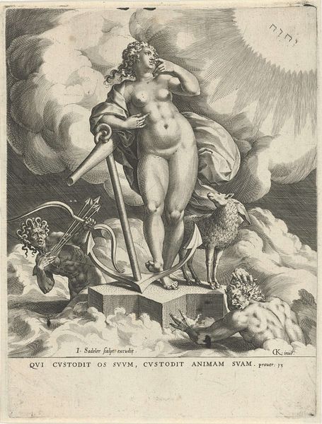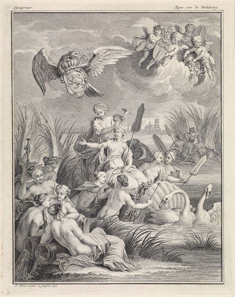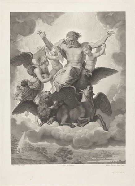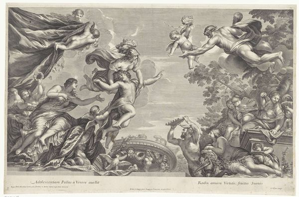 Jan Muller created this engraving, "Apotheosis of the Arts," around the turn of the 17th century, a period marked by significant cultural and intellectual shifts. Muller, working in the Netherlands, situated himself within the late Northern Mannerist style, a movement characterized by its complex, allegorical compositions. Here, the glorification of the arts is staged as a celestial ascent. Winged figures carry the arts heavenward, while below, a crowd of onlookers bear witness. The naked bodies could reference classical ideals of beauty. However, this ideal also obscures the labor and the social conditions that enable artistic production. The figures in the lower portion, presumably artists, are rendered as a collective, their individual identities subsumed under the broader category of artistic endeavor. The engraving serves as a cultural artifact, reflecting the period's values and anxieties. It invites us to consider how art is elevated, by whom, and at what cost.