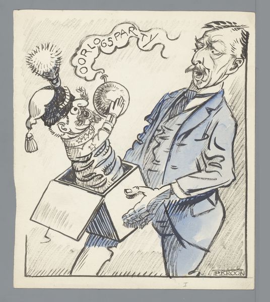 Editor: This is "Treub ruimt op," made sometime between 1910 and 1935, a pen and ink drawing. It's a striking caricature! It looks like a man is sweeping away blocks labeled "leger," "luxe," and "vloot". What's your read on what’s going on here? Curator: It seems to be a satirical comment on political priorities during that time. 'Treub' refers to Pieter Treub, the Minister of Finance of the Netherlands. The words on the blocks—'Leger', 'Luxe', 'Vloot' (Army, Luxury, Fleet)—indicate areas of government spending. It critiques the posturing of the state's use of financial capital. Editor: So, the artist, 'Orion', is suggesting Treub is cleaning house, sweeping away excessive military spending or frivolous luxuries? Is that a common subject for art during that period? Curator: Caricatures like these were quite popular in newspapers and political journals, serving as visual commentaries on current events and public figures. This piece engages with a larger debate about resource allocation and what constitutes responsible governance. Did these kinds of images change or influence public opinion at all? Editor: That's something to think about. How powerfully visual satire affects change, even now! So it’s really about holding power accountable using popular imagery? Curator: Precisely. This artwork shows how artistic expression has served a vital role in democratic societies, encouraging critique, conversation, and hopefully, change. What's interesting to note is the seemingly direct dialogue "Orion" provides, suggesting "here is true cleanup!". Editor: Fascinating to learn the historical context. It gives so much more meaning to what initially seemed like a simple drawing. Curator: Exactly, and it reminds us that art doesn't exist in a vacuum; it’s deeply embedded in its social and political moment.