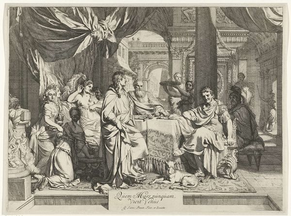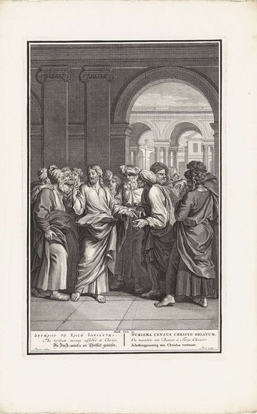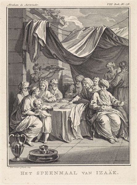 Curator: This engraving from 1744 by Jan Punt, housed here at the Rijksmuseum, depicts "Sara Returns to Abraham." It’s a powerful scene rendered with remarkable detail. Editor: Yes, powerful indeed. The density of the line work almost overwhelms the eye initially, doesn't it? But the figures possess a real weight and solemnity despite the monochromatic rendering. Curator: Punt, a prominent figure in 18th-century Dutch printmaking, created this within a specific artistic and social context. Prints like these were not just aesthetic objects. They were crucial for disseminating historical and biblical narratives, shaping public understanding. Editor: I agree, and let’s focus on the use of line, specifically the hatching technique. Note how he builds volume and depth? Also the composition; the subtle theatrical drape that really enlivens the scene adding dramatic weight to the human interactions. Curator: Absolutely. The backdrop's architecture places the figures in an explicitly staged manner which tells you how performance shaped political messaging at the time, and suggests that women—like Sara here—were political tokens, a notion that aligns with 18th century social history. Editor: Yet look closer at Sarah’s face. Despite the limitations of engraving, Punt communicates Sarah’s emotional ambivalence. She seems caught, pulled, resisting and conforming to an expectation. I’d say she looks more the protagonist than the patriarchal subject. Curator: It's a tension certainly rendered to highlight themes of patriarchy as well as the complex entanglement of women in biblical stories which shaped social consciousness for centuries. Editor: What strikes me most now is the contrast. We have this intensely linear technique attempting to capture incredibly complex human emotions and relationships. An almost ironic disconnect for our current times! Curator: True. Looking at this work encourages us to reflect not just on artistic skills and historical norms, but also on the enduring power of visual narratives in structuring our social world. Editor: It makes you reflect, doesn’t it? Despite its age and stylistic conventions, there's an enduring quality of psychological observation.