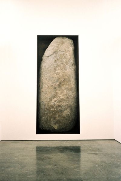 Editor: Here we have Karl Prantl’s "Stein zur Meditation, Engel," or "Stone for Meditation, Angel" from 1988, crafted from marble. Its sheer presence is striking! It has this incredible polished side, like a portal, but the stone’s natural veining makes me think of landscapes and hidden narratives. What do you see in this piece? Curator: This sculpture intrigues me, particularly because of how Prantl merges the spiritual with the earthly through form and material. The highly polished surface acts as a mirror, reflecting the environment, suggesting an ongoing dialogue between nature and the self. Does it remind you of other monoliths or standing stones? Editor: A bit, maybe like something out of 2001: A Space Odyssey? The monolith disrupts the landscape. Curator: Exactly, that cinematic reference works beautifully here. And how might that disruption be perceived? It stands as a modern interpretation of ancient menhirs, places of connection to a larger cosmos, and a focus for ritual practices. It begs us to meditate not only on ourselves, but upon the very essence and origin of things. I'm also struck by the stone's variegated pattern. It hints at hidden images; what figures or narratives do you recognize in the patterns of the stone itself? Editor: Now that you point it out, the patterns in the marble almost evoke an angel form struggling to emerge. That certainly reinforces the meditative and spiritual themes! Curator: Precisely! And think of how that perceived form interacts with the mirroring side - as we contemplate the environment in that mirror, are we also contemplating this angel within ourselves? Editor: It’s fascinating how Prantl uses recognizable symbols and abstract forms to unlock our own interpretations. I see now that he creates more than just a sculpture. He's providing a space to unlock self-reflection. Curator: Absolutely. The sculpture functions as a site, activating personal connections between memory, landscape, and symbol. A catalyst for reflection, not merely a representation.