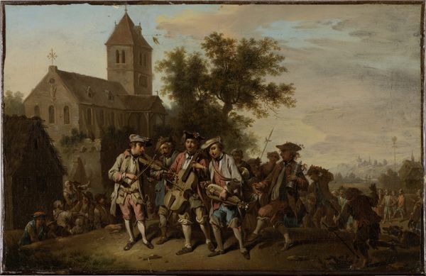 Curator: Agostino Brunias painted "Dancing Scene in the West Indies," showing what appears to be a lively gathering. Editor: My first impression is one of complex layers—the joy of the dance juxtaposed with the backdrop of colonial architecture and power dynamics. Curator: Indeed. Brunias, active in the West Indies, often depicted these scenes of cultural exchange. The dance itself carries deep symbolic weight, representing resistance and the preservation of cultural identity. Editor: Yet, we must question Brunias’s perspective. As a European artist, his gaze inevitably shapes the narrative, potentially exoticizing or romanticizing a reality rooted in oppression. Curator: Absolutely. And the clothing, the gestures, even the landscape—each element hints at a complex interplay of cultures, power, and resilience. Editor: By examining the image’s historical context, and acknowledging the artist's bias, we can unravel its nuances and engage with its unsettling legacy. Curator: I find myself contemplating the dual existence embodied here. The vibrant dance is both a joyful expression and a testament to a culture enduring in the face of adversity. Editor: Ultimately, this artwork serves as a reminder of the complexities of history, urging us to confront uncomfortable truths and embrace a more nuanced understanding of the past.