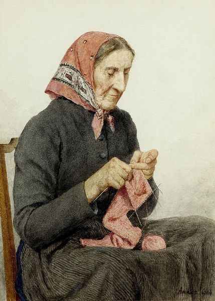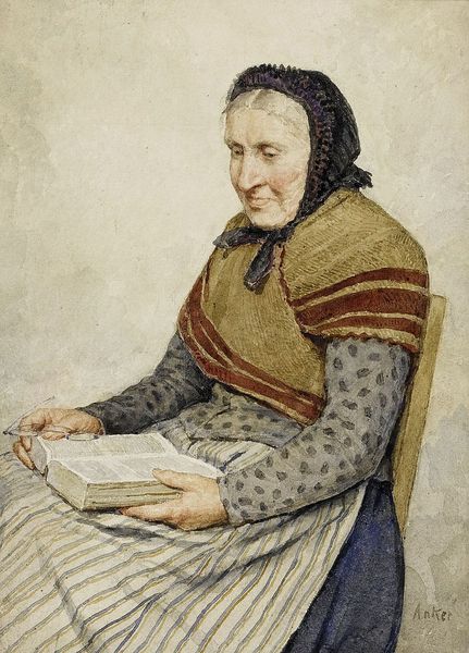 Curator: Here we see "Sitting Peasant Woman Holding A Cup In Her Hand," a watercolor work crafted in 1909 by Albert Anker. Editor: The somber mood of the composition strikes me first. The earthy colors and the subject's gentle gaze suggest a moment of quiet contemplation. Curator: Precisely. Anker's paintings often depict intimate scenes of everyday life, elevating the peasant class. This piece can be viewed as part of the broader realism movement of the time, focusing on representing subjects without idealization. Note the meticulous representation of the rural objects. Editor: Absolutely. Look at the intricate details in her traditional headdress and the patterns on the cup. The texture of the fabric, and the way the light catches the silverware adds an incredible sense of realism. This emphasis on the mundane transforms the painting into something exceptional, almost reverent. Curator: I agree. What's crucial is that Anker was attempting to establish the significance of genre paintings. At a time when history paintings and portraits of the wealthy dominated, the artwork offered a glimpse into the cultural norms of the time, inviting a direct engagement with those values through art. The act of sitting, holding the cup, all transform into a study of personhood through the artist’s keen perception of life. Editor: Thinking about it now, that is a wonderful point. He takes an ordinary scene and turns it into an occasion of significance, celebrating the virtue in the subject’s day to day. Curator: It prompts us to consider whose stories get told and remembered through art. Anker clearly sought to depict and appreciate the dignity of ordinary Swiss life in an era defined by rapid modernization. Editor: Ultimately, it's Anker’s skillful brush that provides an enduring moment. He masterfully balances realism with a sensitivity that resonates even today. Curator: Agreed. The painting certainly compels us to rethink the idea of mundane daily life and the possibility of its value, when represented in painting.