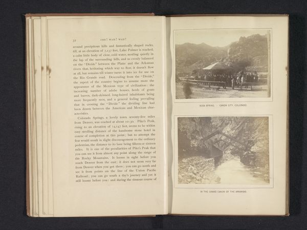 Curator: Ah, here's a particularly charming page. The photograph featured is titled "Top of Lal Lal Falls, near Ballarat, Australia." It was captured by H. Crips sometime before 1895, a classic landscape study. Editor: It feels almost dreamlike, doesn’t it? That blurring effect on the waterfall makes it seem like something out of a myth, all mist and movement. There’s a stillness to the surrounding nature that I find so striking next to it. Curator: Yes, there’s an interesting juxtaposition at play here. Consider how Crips frames the waterfall within its natural environment. The composition guides the eye from the static trees to the cascade, building a powerful contrast between stillness and flux. Semiotically speaking, the rushing water could represent the passage of time against the enduring landscape. Editor: And the light, too! See how it catches the top of the falls and then diffuses into the shadow below? It's dramatic and makes the falls appear almost ethereal. It is incredible the way that the artist framed the scene with the trees on the side with a bit of light leaking to the ground. Makes the landscape incredibly beautiful, in its natural state. Curator: Indeed, the use of light and shadow—chiaroscuro, if you will—emphasizes the three-dimensionality of the scene. In structuralist terms, we can view the composition as a system of binary oppositions: light versus dark, movement versus stillness, nature versus (implied) human presence, since someone had to photograph this scene from a distance. These oppositions generate meaning. Editor: It also captures a slice of old-world serenity. You almost expect fairies to start flitting around in the water! And even a small photograph makes you appreciate the sublime experience of seeing the grandeur of nature—to this end it really does its work perfectly. Curator: Agreed, there's something quite timeless about it. A meditation on nature’s beauty, rendered with a sensitivity to form and light. It gives insight into the way artists see the world, the perspective they can convey to those looking back at these scenes.