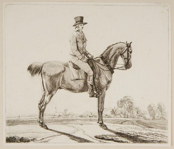 Editor: Here we have "Horsemen (2)" by Wilhelm von Kobell. It's a striking drawing, very crisp lines, depicting a man on horseback in what seems like a casual pose. What’s your take on this piece? Curator: This work gives us a window into the equestrian culture and social hierarchy of 19th-century Europe. Consider how the artist uses line to convey not just the physical appearance but also the social status of the rider. Editor: The rider does look quite self-assured. Is that something that would be read by viewers at the time? Curator: Absolutely. Think about the role of horses in warfare and aristocracy. The confident pose, the quality of the horse, even the background landscape, all contribute to a narrative of power and control. Editor: That's fascinating. I hadn't considered the social implications embedded in the image itself. Curator: Exactly. By examining art through a historical lens, we uncover its deeper social and cultural meanings.