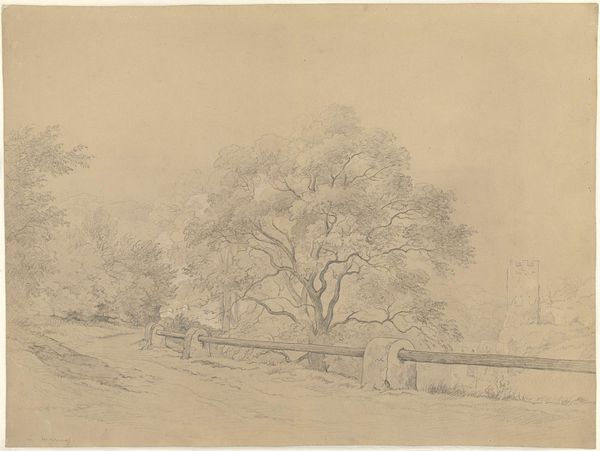 Antoine Pierre Mongin rendered this graphite drawing of the Park at Versailles, capturing a memorial column encircled by trees. The column, a symbol of remembrance, carries echoes of ancient obelisks and triumphal pillars. Recall Trajan's Column in Rome, a spiraling narrative of conquest. These forms aren't merely stone; they're vessels of collective memory. They remind us how societies commemorate and mythologize. Here, the column stands amidst a carefully cultivated grove, nature shaped by human will, much like our memories are pruned and arranged over time. Consider how the image triggers a sense of melancholic contemplation. This feeling is not new; it echoes through the ages. Think of the Romantic ruins paintings by Caspar David Friedrich. The column acts as a locus for our own meditations on the past and the inevitable passage of time. These symbols recur, not in a linear progression, but spiraling, as the column here reminds us, each return colored by new contexts and experiences.