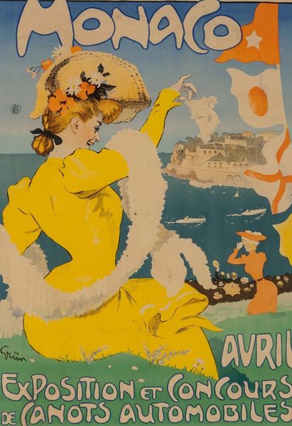 Curator: Ah, look at this stunning lithograph; an "Untitled" poster by Jules-Alexandre Grün! The Belle Époque radiates, doesn't it? Editor: It certainly does, but I’m more drawn to the process involved. A lithograph print like this was revolutionary for mass communication and advertising, allowing posters like these to be made everywhere! How do you read it? Curator: Pure escapism! A glimpse into Monaco's azure coastline, a redheaded beauty steering a sailboat, seemingly carefree. It’s like a day dream, so light! The white city sits against the misty mountains in the background. The composition draws your eye around the boats and water. Editor: Right, but this "escape" was carefully crafted. These weren’t just landscapes but calls to consume Monaco: buy a dream, experience its luxury. The title reveals more about its context; "Exposition et Concours de Canots Automobiles," quite literally boat races! And note that automobiles and gas run those boats: this lithograph has layers, promoting consumerism in a changing, technological world. Curator: Perhaps. Yet there’s also a simple joy. I feel the salt air. Grün captures a carefree joy... you want to be her! A bit melancholic maybe. There's a mystery to the lady at the helm...what is she looking for beyond the bay? Editor: That "mystery" is wrapped up in class and consumption, in creating a desired lifestyle for the burgeoning middle classes, enabled by the new technologies and reproductive techniques of printing at the time. Curator: Always an earth-bound point of view. Still, there's room for a touch of fantasy and escapism here too...even while understanding the processes used. It's like letting yourself get carried away even knowing the reality that tethers you. Editor: Precisely. It allows us to see those things, those contradictions inherent in both enjoying and being critical of our consumerist pleasures.