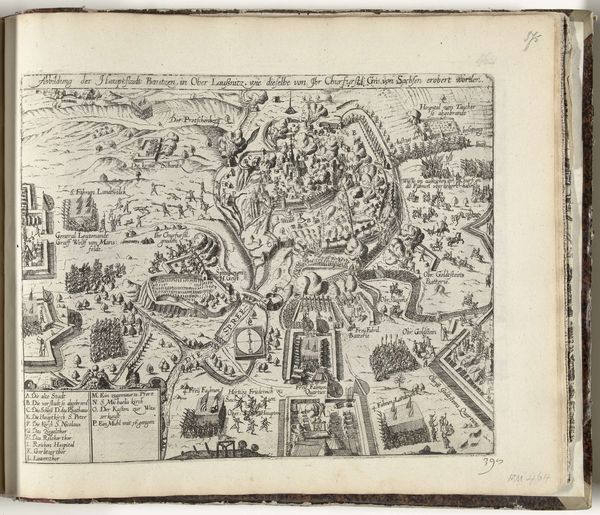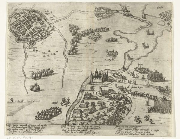 Curator: We're now looking at a print titled "Beleg van Schenkenschans door de Spanjaarden, 1597," created in 1599 by an anonymous artist. Editor: It’s busy, isn’t it? Quite chaotic actually, but in a very meticulously rendered way. All these tiny figures moving across the landscape—it's overwhelming at first glance. Curator: Indeed. It's an engraving depicting the siege of Schenkenschans, now a part of Germany near the Dutch border. As a history painting, the work shows Prince Maurice’s forces reclaiming Schenkenschans. The anonymous engraver would have relied on accounts of the event to create it, considering that these prints are critical documents chronicling military events of the period. Editor: I find it fascinating how the map-like perspective gives it this sense of detached objectivity. It’s as if we're surveying the entire battlefield from a god-like viewpoint. Yet, there's still a clear narrative being constructed through the placement of figures and the detail given to the fortifications. Look at how strategic points in the town were indicated—almost diagrammatic. Curator: Precisely. That bird's-eye perspective, which combines mapping with history painting, emphasizes strategic power, making visible control over terrain and populations. We have this tension between geographical precision and allegorical significance, especially considering how the print aims to demonstrate Dutch power through clear legible information, underscoring a specific political perspective regarding Dutch independence from the Spanish. Editor: And that tension is very powerful formally! You almost get the feeling that the overall formal quality takes second fiddle to that impulse, or even sacrifices a complete visual harmony for clarity of the scene. Curator: Well observed, that balance of representation and artistry also reveals what these visual materials meant to those viewing them, not simply to modern interpreters like you or me. I always see visual prints and publications like this one at the Rijksmuseum, it makes you understand that the images are designed to convey distinct meanings that affect collective identities of all kinds. Editor: Looking closer, I see so much attention paid to scale, giving it a hyperrealistic mood. I think this helps create a sense of historical reality for the events of the siege of Schenkenschans. Curator: A sharp insight, indeed! As an object, this detailed and skillfully made print highlights how art participates in a complex interplay of communication and documentation—an intriguing perspective that invites contemplation on the socio-political conditions of image making at that moment. Editor: Right. Analyzing prints such as these really makes us rethink our preconceived assumptions about history!