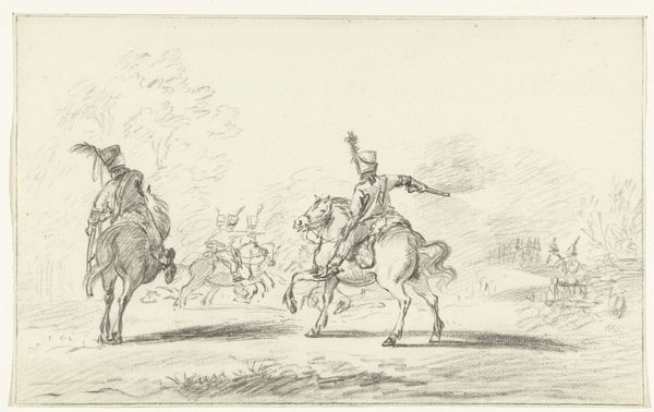 This pencil drawing by Cornelis Albertus Johannes Schermer depicts a cavalry horse and a lancer, a scene brimming with martial symbols. The horse, a timeless emblem of power and nobility, is here bridled by a soldier, representing the harnessed might of the military. Consider the symbolic weight of the horse, a motif that gallops through art history. From the equestrian statues of Roman emperors to Renaissance battle scenes, the horse embodies strength and dominance. Here, its restless stance suggests barely contained energy. The presence of a sword hanging loosely hints to potential conflict. The rider in the background suggests imminent military action. These evoke a primal response, tapping into our collective memory of conflict and defense. This image is not just a depiction of a soldier and his horse, but a powerful evocation of the readiness to war and defense. Such scenes, repeated across centuries, form a visual language that speaks to our deepest instincts.