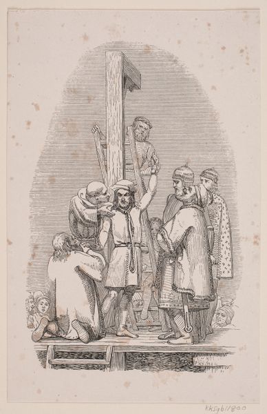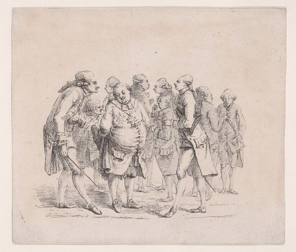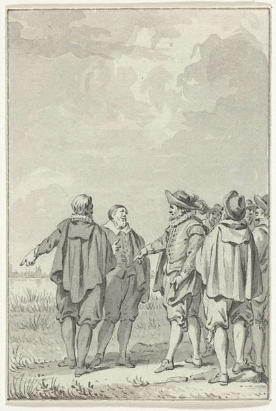 Editor: This ink drawing on paper, “Christ Bound between Two Soldiers and a High Priest,” was created by Gerbrand van den Eeckhout sometime between 1638 and 1642. The raw vulnerability in Christ’s figure really strikes me. How do you interpret the scene's symbolism and emotional weight? Curator: Notice how the artist uses light and shadow? It's not just to illuminate, but to convey an emotional atmosphere. The darkness surrounding Christ seems to symbolize the spiritual darkness of his captors and the injustice of the scene, and the symbol of Christ bound is something that repeats throughout time and cultures. How does that iconography speak to you? Editor: It's powerful, because I think of injustice in our world today, how power can corrupt... I guess it’s something people have felt across the ages. Curator: Precisely. Eeckhout’s use of baroque style, combined with stark figuration and clear narrative, creates a work steeped in pathos and imbued with deeper cultural and psychological meaning. We, as viewers, are placed within a tradition of witnessing suffering and, perhaps, questioning authority. Do you agree with this visual representation of this specific scene? Editor: I do see it that way. I hadn’t considered it that way, but you are absolutely right. There is almost an element of staging to the image; a moment presented for observation. I learned a lot! Curator: Me too! It’s incredible how much history and emotion can be packed into simple lines. Each mark carries a cultural echo.