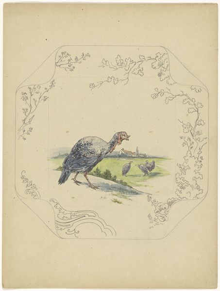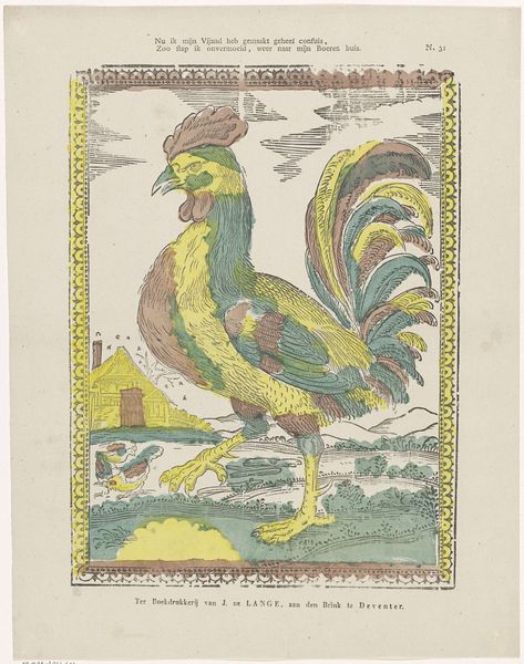 This color etching by F. Houtkamp depicts a rooster and was printed in the Netherlands. The image is a kind of visual riddle, typical of Northern European art. It combines an allegorical image with a bit of verse, inviting the viewer to decode its symbolism. The rooster, an animal associated with pride, but also vigilance, stands in a landscape with a farmhouse in the background. This imagery speaks to the Netherlands' burgeoning sense of national identity in the 19th century, even as it was still under foreign rule. The etching may critique the perceived vanity of the Dutch, or perhaps celebrate their industriousness. To better understand this image, we might investigate the popular folk traditions of the Netherlands. What proverbs or songs featured roosters? What did the rooster symbolize in Dutch art and literature of the time? Only through such social and institutional histories can we fully grasp its meaning.