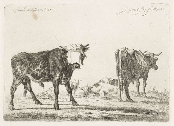 Curator: This etching, titled "Geblinddoekte stier bij kudde runderen"—"Blindfolded Bull with Cattle"—was created by Jacobus Cornelis Gaal in 1852. It's part of the Rijksmuseum collection. The landscape features a small herd, with the title’s blindfolded bull most prominent. Editor: The first thing that strikes me is the texture. It’s created solely through line work, of course, but Gaal coaxes so much tonal range from the etching technique. It has a moody, almost oppressive quality. Curator: Indeed. Looking closer, the symbolism is layered. The blindfolded bull immediately conjures ideas of powerlessness and the vulnerability of working animals, especially when we consider the context of agrarian society at that time. The industrial revolution was rapidly shifting social and economic dynamics in the Netherlands. Gaal was directly responding to themes of dispossession and shifting power. Editor: Right, but technically, the composition is compelling too. See how the bull, though dominant, is skillfully integrated into the landscape? It isn’t merely placed upon it, which you might see in lesser works. Gaal masterfully blends foreground and background—and light and shadow. Notice how your eye is led gradually deeper into the scene by his use of shading, the other cows being strategically located to aid this feeling of depth. Curator: This isn't just about visual depth, it's about the socio-political conditions of the rural working class. The bull can be interpreted as the working class in general—their labor exploited while they're kept unaware of their exploitation, figuratively blindfolded. Editor: Well, I find the technical choices create an emotionally fraught work of art, regardless of class commentary. Curator: The enduring impact lies precisely in how the technical—the artistic decisions Gaal makes—communicate these socio-economic messages, not only as historical documentation but also with an eye towards how hierarchies of power still impact society. Editor: Ultimately, I think it's a testament to Gaal's mastery that the print offers so much to consider. His technical artistry alone makes this worthy of sustained engagement.