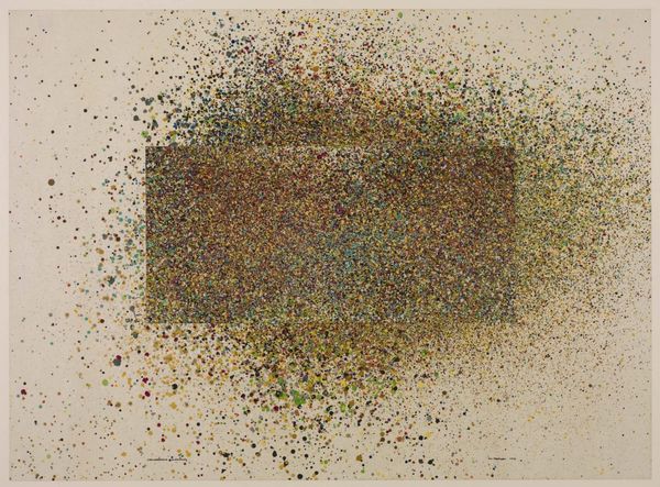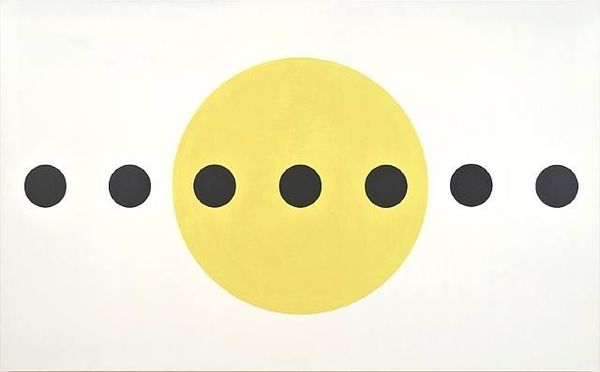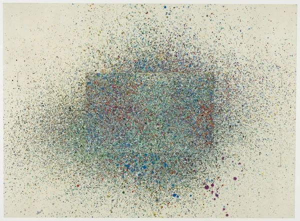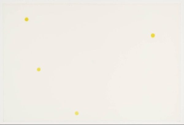 Curator: This is Bernard Cohen’s "No. 2," a work that resides in the Tate collection. Its creation date is unknown. Editor: My immediate reaction is…quiet. The large white space feels like a hush, with these sparse dots of color almost tentative. Curator: Cohen’s work emerged within a British art scene grappling with the legacies of abstraction. These dots are deceptively simple. Editor: They feel incredibly intentional, though. The placement, the delicate diffusion of the pigment… it avoids being sterile through its subtle imperfections. Curator: Indeed. Cohen's work was shown alongside artists engaged in debates about the social function of art. Did abstraction serve a purpose? Editor: I think so. Maybe not a didactic one, but the work can prompt a sort of meditative space, a quiet moment of contemplation away from the clamor of daily life. Curator: It’s interesting how the political role of art can evolve over time, from direct commentary to offering a space for reflection. Editor: Yes. Seeing it now offers me a place to find a new way to engage in a very noisy world.