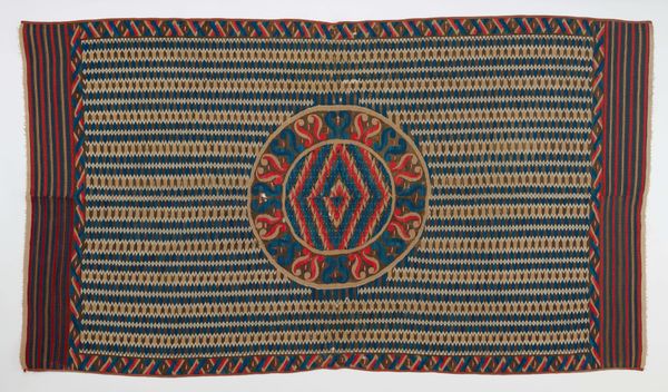 Curator: Here we have a fascinating example of a textile artwork, simply titled "Skirt," dating back to the 20th century, a vibrant piece currently housed at the Minneapolis Institute of Art. The artist or origin of this artwork is, to this day, not fully known, so its interpretation and preservation is vital. It seems to utilize materials like cotton, silk and other fibre art to achieve such a layered design. What are your first thoughts on it? Editor: My immediate reaction is to its subdued yet hopeful nature. The dark base contrasts sharply with the band of vibrant color running through the center. It evokes a sense of resilience. Curator: Absolutely. Considering its medium and purpose as a garment, this “Skirt” likely carried deep social meaning. Textiles are crucial cultural artifacts in many communities globally. This piece, in its design and construction, could have represented the status, beliefs, or affiliations of its wearer within a very specific societal hierarchy. Editor: Indeed. And I'm drawn to the symbolic language. The repeated diamond shapes along the central panel for instance—diamonds often represent clarity, enlightenment. Their repetition here could indicate a desire or prayer for guidance in one's path in life. Furthermore, in certain cultures diamonds signify wealth and abundance—but not just in the monetary sense. They might represent the treasures of the spirit or intellect. Curator: I find myself agreeing, though also I cannot help to notice the potential impact of museum settings in influencing that very interpretation. An object's context is crucial. A museum label can instantly change our understanding. In other words, we risk removing this skirt from the actual cultural moments of the time, but isn't this the fundamental task of cultural stewardship and interpretation, anyway? Editor: It's a double-edged sword. We strive to provide context and enrich the experience, and in doing so we might unintentionally steer interpretations, I suppose. It forces us to always ask 'whose history?' Curator: Precisely. A challenge and also privilege for the institution and its curators. Thank you for that illuminating interpretation. Editor: The pleasure was all mine. What a poignant piece!