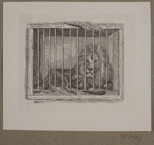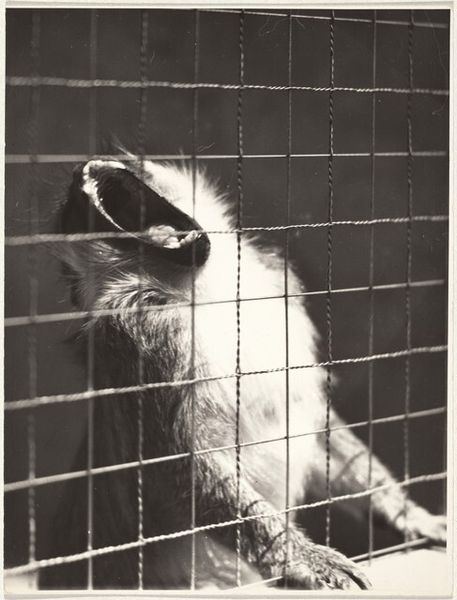 Curator: This small photograph by Jack Gould, entitled "Untitled (two gorillas in zoo cage)", really captures a sense of confinement. Editor: It's heartbreaking, honestly. The bars of the cage are so prominent, and the gorilla's expression seems…defiant, maybe? Or just deeply sad. Curator: Gould's image invites us to consider the complex ethics of zoos within our cultural landscape. The gorillas, as sentient beings, are presented for public consumption, their natural existence commodified. Editor: Absolutely, and the composition emphasizes that power dynamic. We're looking in, they're trapped. It's a potent symbol of human dominance and our exploitation of the natural world. We have to ask, whose gaze are we centering here, and at what cost? Curator: It is a compelling image that challenges viewers to question our relationship with animals and the spaces we create for them. Editor: A painful but necessary reflection.