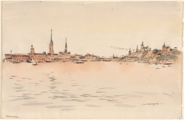 Curator: Let's take a look at Muirhead Bone's "Ayr, from the River," an etching created in 1909. The view captures the Scottish town, presenting its architecture reflected in the river's surface. Editor: There's a stillness about it, a subdued calmness. The muted tones of the etching emphasize the quiet, almost melancholic mood. I'm struck by how light and delicate the lines are, despite the density of the cityscape depicted. Curator: Bone’s work frequently explores the interplay between urban development and its impact on the landscape. "Ayr, from the River" captures a moment where the industrial and the natural co-exist, which was a growing focus in the artistic climate during the early 20th century. The question of modernity was really taking hold. Editor: Yes, and thinking about those questions of modernity, the etching feels rooted in the realities of everyday life for working-class communities who inhabited such towns, with their dense housing along the riverfront. Was he aiming to provide some form of commentary on social change, on their experience within industrial growth? Curator: That's definitely something to consider. The Arts and Crafts movement was in full swing, pushing back against industrial standardization. Bone’s work, through its subject matter, puts forward a view of progress and its potential cost. I'd argue that Bone might be seen as humanizing an urban landscape when there was also huge exploitation occurring within society and industrial progress. Editor: I agree, particularly the way the light filters through the clouds to settle on rooftops of buildings. How do we account for those often excluded perspectives that shape such townscapes in the narrative and meaning of artworks of the time? It almost softens the starker edges of reality. Curator: That is something Bone seems acutely aware of, and manages to evoke so gracefully here. He offers a layered and socially astute meditation. Editor: Precisely. It is a powerful statement—gentle yet incisive—that reminds us that behind every building and bridge is a human story shaped by labor, by environment, and ultimately, by their own resilience.