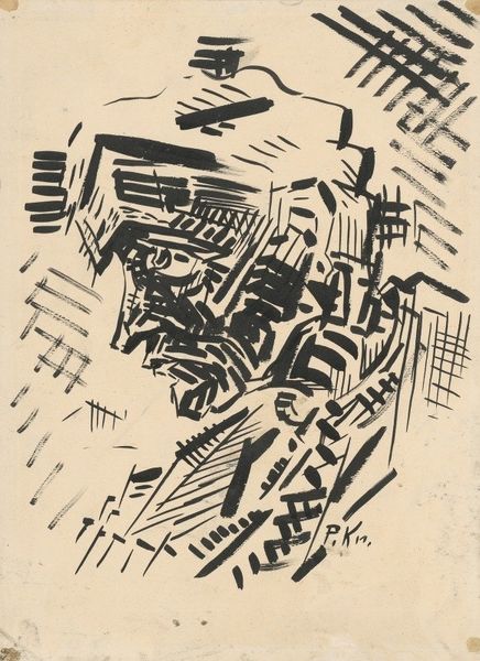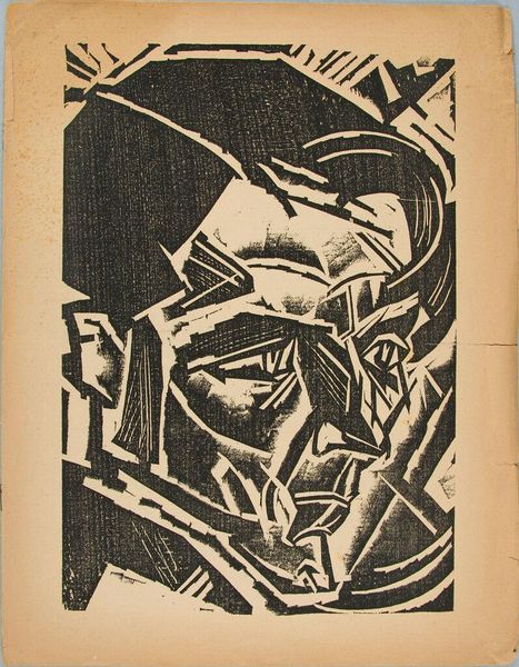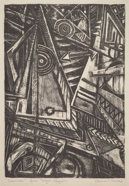 Adolf de Haer created this woodcut titled "Conversation with Fish" employing stark black lines against the pale substrate of the paper. The high contrast grabs our attention, evoking the bold expressionist woodcuts of the early 20th century. The artist fragments the pictorial space into angular shards, disrupting any sense of naturalism. Notice how the fish are integrated within this fractured composition, almost as if they are dislocated parts within a larger disrupted system. De Haer pushes the formal limits of representation to the point where the natural world is nearly unrecognizable. Consider how the composition, with its sharp lines and contrasting tones, produces a sense of unease. This tension resonates with broader concerns of the era, reflecting the collapse of traditional values. The woodcut medium itself, with its rough texture and potential for graphic impact, becomes a signifier of modernity's destabilizing forces, prompting continuous dialogue.