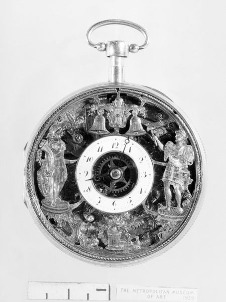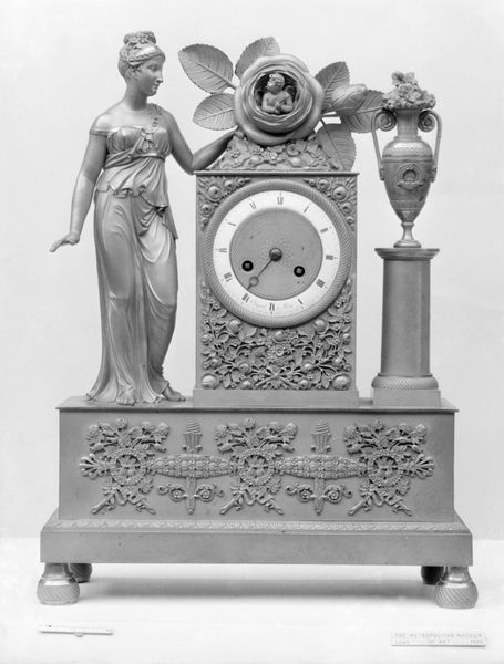 Curator: Here we have a stunning example of late 18th-century decorative art: a mantel clock featuring Venus and Cupid, crafted between 1777 and 1796, likely in France. Editor: It's striking! There's a playful dynamism about it. Venus is perched almost casually, while Cupid seems to be reaching towards… are those birds? Curator: Indeed. They seem to be tethered, suspended in flight—perhaps symbolic of Love's fleeting nature or being tied to Venus. Made of bronze, with this creamy marble base, the sculpture work, which some attribute to Renacle-Nicolas Sotiau, has the kind of flair favored by those seeking more decorative displays. How do the mythological figures speak to you? Editor: Well, seeing Venus presented like this evokes thoughts of idealized beauty during the Rococo period, but also raises questions about power dynamics and social expectations around love and marriage in that era. Curator: An interesting tension to note given the material’s implicit relationship to temporality through the object's function. The figures embody classic beauty, yet time marches forward. Also Cupid's presence is significant. Often representing desire and affection, here he is very active and reaching toward Venus who, while prominently positioned, appears more static, contemplative perhaps? It's an active image inviting readings that challenge sentimental readings. Editor: Definitely. We're looking at how objects reinforce status but also play within established systems of representation. Notice the details on the base, miniature sculptural vignettes which suggest wealth and sophistication which only certain sections of the 1790’s population possessed. What might be implied in associating idealized and timeless images from Greek mythology alongside everyday displays of social currency. Curator: So true. I appreciate the suggestion that time is also on display. Each glance reveals not merely the hour, but the era, power, wealth, and love under constant negotiation. Editor: Absolutely! This clock does far more than tell time; it chronicles its era, prompting us to examine the forces that shaped it, forces of cultural and economic power still resonant today.