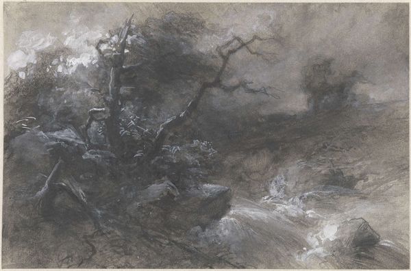 Editor: We’re looking at Karl Bodmer's "Ruined Towers Overlooking the Rhine," a pencil, graphite, and charcoal drawing from 1835. The immediate impression I get is of romantic decay, a somber mood evoked by the ruined architecture amidst a dramatic landscape. What do you see in this piece? Curator: I see more than just romantic decay; I see a visual commentary on power, history, and the natural world's reclaiming of human endeavors. Bodmer presents a Rhine landscape marked by the vestiges of past empires. These ruins, rendered in monochrome, invite us to reflect on the narratives of dominance, conflict, and eventual decline that have shaped the region. The drawing embodies the Romantic era's fascination with ruins, doesn't it? Editor: Definitely! But what does the setting of the Rhine contribute to this interpretation? Curator: The Rhine was a potent symbol of German identity and history. The ruins along its banks served as constant reminders of past conflicts and shifting borders. In the context of 19th-century nationalism, Bodmer's work could be read as an inquiry into the making and unmaking of nations, highlighting the ephemeral nature of human power set against the enduring power of nature. How does the absence of color impact your reading? Editor: It adds to the sense of distance, both temporal and emotional, almost like looking at an old photograph. I also feel that this piece speaks to the idea of humanity's smallness compared to nature's vastness and persistence. Curator: Precisely. The use of pencil, graphite, and charcoal lends itself well to creating this sense of vastness but also intimacy, drawing the viewer into the quiet contemplation of time, memory, and the cyclical patterns of rise and fall. It’s a subtle critique of progress and the narratives we construct around it, don't you agree? Editor: I do. It’s amazing how much a seemingly simple landscape drawing can tell us about history and our place within it.