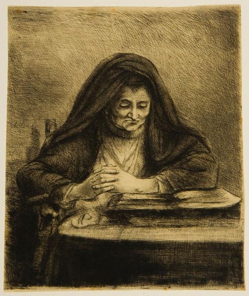 This is 'Lezende vrouw,' an etching by Jan Chalon, made around the late 18th century. The print shows a woman seated at a table, head bowed and hands clasped in what appears to be prayer. The artist's use of etching creates a tonal range from light to dark, giving the image a strong sense of depth. Notice how the composition is structured to draw the eye to the woman’s face and hands, the focal point of the work. The texture of the etching lines adds to the overall somber mood. Looking at Chalon's work through a structuralist lens, we can decode the visual elements. The downward gaze and the darkness enveloping her head can be seen as signs of introspection or mourning, common themes explored during this period. Chalon uses form to elicit an emotional response, inviting us to consider themes of piety, solitude, and the human condition. This etching remains open for new interpretations, influenced by our own cultural and philosophical contexts.