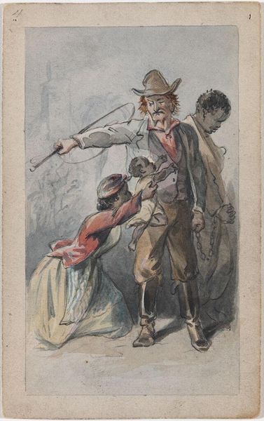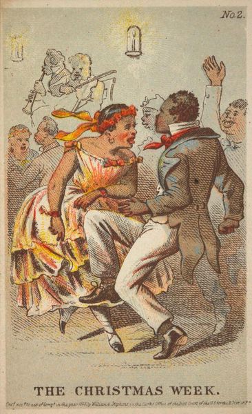 Curator: I love the lightness of Henry Louis Stephens' "Study for 'The Christmas Week.'" It's a small watercolor, only about 11 by 7 centimeters, housed here at the Harvard Art Museums. Editor: It feels celebratory, a bit cheeky. The figures have such animated faces; you can almost hear the music and laughter. Curator: Absolutely. Stephens has captured such a sense of merriment. The garland of flowers worn by the dancing woman, for instance. Garlands symbolize celebration, of course, but they're also tied to rituals of renewal and the cyclical nature of time. Editor: And the way the figures in the background are only sketched in, almost like ghosts, makes the central couple pop—they become the focus of all the energy. Curator: Precisely. It's like they're stepping out of a dream, a memory perhaps. And the slightly off-kilter perspective adds to that feeling, doesn't it? Editor: It does. It's both captivating and unsettling, which for me, is what makes art truly sing. A real glimpse into a hidden moment.