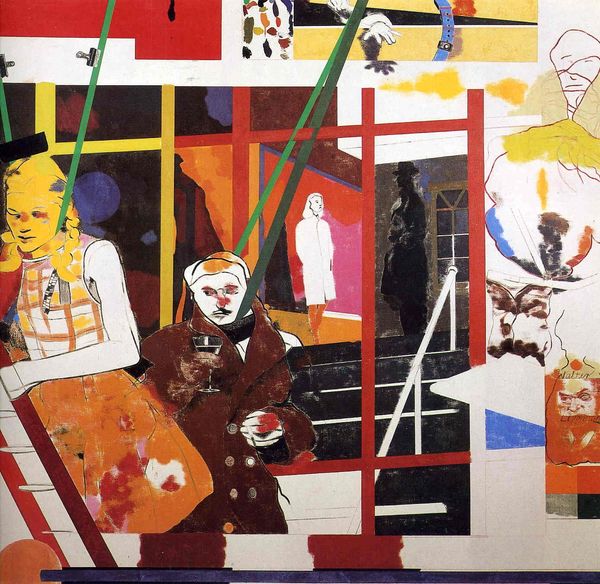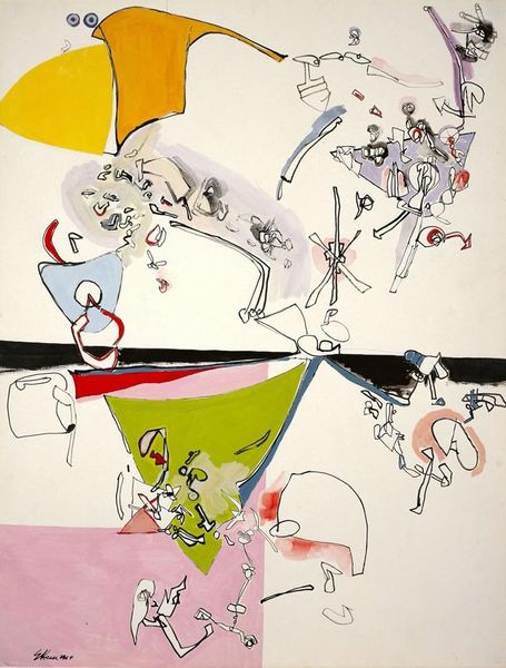 Editor: Hans Hofmann's *Magenta and Blue,* painted in 1950 with acrylic on canvas, strikes me as a visual puzzle. Its composition is a riot of shapes and colors, yet I can’t quite put my finger on what it all means. What do you make of this explosion of form and color? Curator: Explosion is exactly right! Hofmann, you see, he's not just throwing paint at a canvas, though it may look like it at first glance. He's wrestling with space, pushing and pulling those colours – magenta against blue, of course, but all the others, too – creating a tension, a visual vibration. Imagine color as a force, a life force even. And this, this canvas is where it all collides! Don't you feel it? That almost unsettling energy? Editor: I do feel the energy. The colours definitely vibrate! So it’s less about what something *is*, and more about what it *does*? Curator: Precisely! It’s about the *doing*. The act of painting itself, that “push and pull” he called it, the way colour interacts with colour. The canvas isn’t a window onto a scene. No. It's the scene itself. A world being born, wouldn’t you say? It is as if he invites the viewers to do that last bit of painting themselves. What does it mean for *you*? Editor: That's a wonderful thought – that the artwork remains forever alive, incomplete without me adding to it with my feelings. Curator: I rather liked how you brought that home. Cheers to feeling that buzz of color and form. It will make your life interesting.
