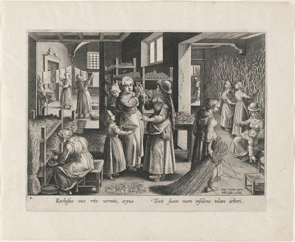 Curator: Here we have a fascinating print, dating to 1595, titled "The Silkworm Eggs Spread Out On Shelves," plate 4 from the series "The Introduction of the Silkworm." It’s by Karel van Mallery and currently resides here at the Metropolitan Museum. Editor: My first impression is the intense labour suggested by this busy interior; so many figures, engaged in different repetitive tasks. It's fascinating to think about all the material transformation that went into silk production at this period. Curator: Absolutely. Consider that silkworm cultivation and silk production were incredibly important industries, subject to specific regulation, trade, and often considered as specialized female labor. This print is one of several illustrating the various stages, aiming to celebrate and inform about it. The prints would be circulated to share new and relevant imagery, especially when technologies were developing and techniques sought wider circulation. Editor: You're right, and that circulation aspect highlights an interesting tension. It's trying to communicate the complex processes inherent in silk production, almost as if rendering visible what is otherwise obscure – labour. But is this celebratory? Look at the limited role of light pencil work or tonal variations across a scene that almost lacks affect for its many protagonists. Curator: Well, engravings, particularly at this time, often served a didactic purpose. It wasn’t necessarily about celebrating the artistry of the workers themselves but showcasing the system, demonstrating the supposed 'advancement' in knowledge to elite society. How to optimize a new manufacturing process to the marketplace, say? Editor: Perhaps the silkworms are the main actors. Consider all that is required to coax those creatures to transform one material into another! You have to hand it to them and their complex digestive and transformation abilities. And then there is that final, woven product we fetishize with elegance and luxury, despite not even understanding its origins in insect secretion! Curator: An interesting consideration, certainly. This piece acts, for me, as a lens through which we see early knowledge economies playing out, reflecting specific assumptions about labor and societal progression. Editor: I’m left thinking about our complex relationship to materials; our ongoing and collective extraction, refining, consuming… Hopefully we will become wiser in time.
