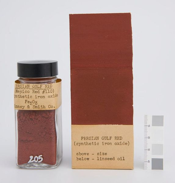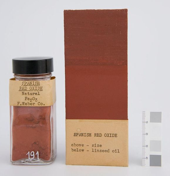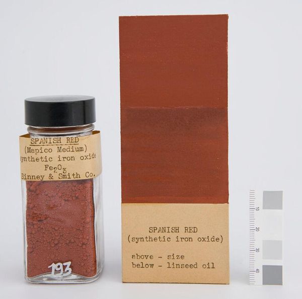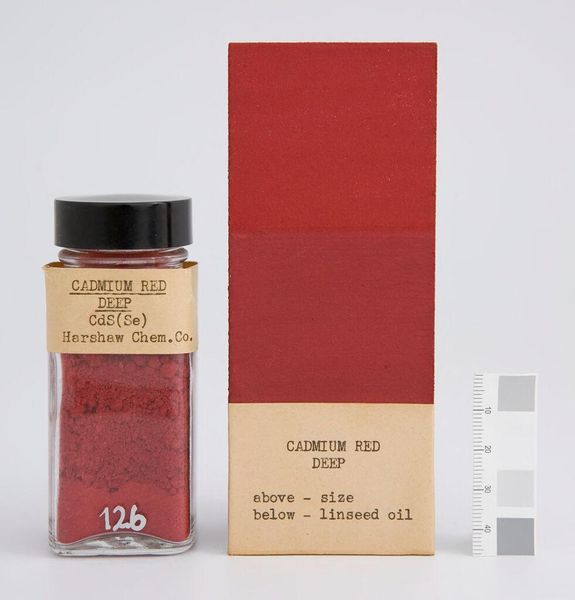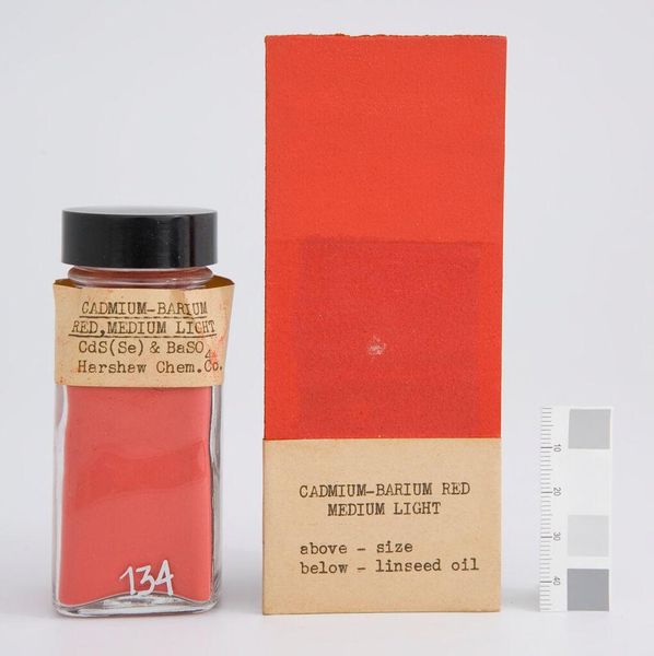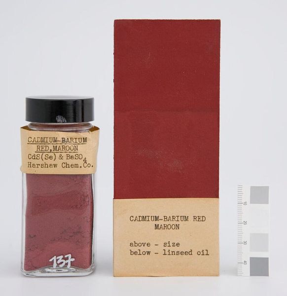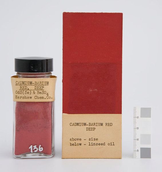 Editor: So, this is "Cadmium-Barium Red, Deep Maroon," made by the Harshaw Chemical Company. It's just pigment, but I find it really striking. What sort of cultural weight does a color sample like this carry? Curator: Red often evokes strong emotions—passion, anger, even sacrifice. Cadmium-Barium Red, specifically, with its deep maroon shade, might suggest something more somber, like dried blood or old velvet. The chemical company's label hints at a transition, from the natural to the industrial. Editor: So, is it a symbol of industrialization's impact on art? Curator: Precisely! The pigment, once derived from the earth, is now synthesized, mass-produced. This shift impacts how artists access and use color, changing their visual language. Editor: That's a powerful observation. I hadn't thought of it that way. Curator: Consider what is gained and lost when the earth yields to the laboratory.