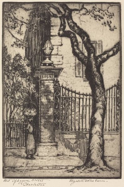 Editor: Here we have Henry Farrer's "The Crooked Stoop (Old Tom's Chop House)," an etching from 1870, currently held at The Met. The first thing that strikes me is the use of light and shadow; it creates this incredibly textured surface on the brick. What formal elements stand out to you? Curator: Indeed. Note the composition's pronounced verticality, contained by the arch at the top. The sharp contrast between the precise brickwork and the amorphous shadows calls attention to the materiality of the architecture. Farrer plays with geometric structure against the softening effects of light, and how it dissolves the tangible. Observe how the lines converge, leading the viewer's eye to the darkened threshold, inviting questions about what lies beyond. Do you perceive any sense of depth? Editor: Yes, but it feels very shallow, almost theatrical, like a stage set. How does the stark contrast contribute to the overall structure of the piece? Curator: The strong chiaroscuro accentuates the geometric volumes of the steps and the rectangular sign, thus reinforcing the dichotomy between solidity and shadow. The eye jumps to different parts of the work—signage and decoration are arranged, calling to the architectural whole and establishing structural relationships in light and dark. This emphasis compels us to read it not as merely representational but as a study of form itself. Editor: That’s interesting. I was focused on the subject, but your reading encourages us to analyze Farrer's structural decisions in composing this piece. Curator: Precisely. It redirects us to the underlying visual language the artist employs to create a compelling image, less concerned with narrative than with aesthetic syntax. Editor: It gives me a completely different lens to observe art. Thanks so much for your perspective!