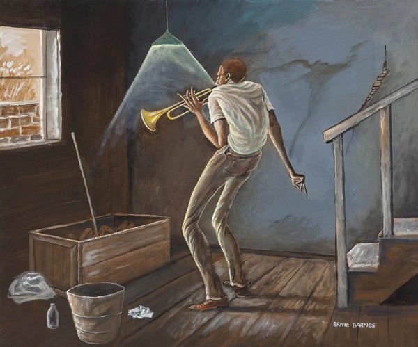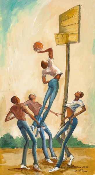 Editor: Ernie Barnes’s “Set Shot,” painted in 1982, presents us with a figure caught mid-basketball move against the backdrop of a weathered house. It’s quite striking, almost dreamlike in its simplicity. I’m particularly drawn to the tension in the figure’s stretched form. What do you see in this piece? Curator: Ah, yes. Ernie Barnes had a gift for capturing movement, didn't he? And that elongation of the body, his signature, is especially poignant here. I see a dance between aspiration and environment. Notice how the rough texture of the house mirrors the makeshift basketball hoop—a certain kind of beauty found in resourcefulness. It reminds me of summer days spent on neighbourhood courts with friends. But look closely at that tilted basketball hoop. Editor: I hadn't considered that parallel before! It does add a new layer to the story, implying resourcefulness with the lopsided net. What does that make you feel? Curator: You might consider what Barnes is communicating beyond just the pure joy of sport and of reaching a goal. I think the tilting net and its basket speak volumes to this picture! Perhaps he felt as though success or that “winning shot” may never arrive for all the players involved, if life or success isn't easily granted but precariously, and that makes this an unforgettable artwork. Don't you agree? Editor: That’s a much deeper reading than I initially had, I had never thought to bring those thoughts or considerations to this. So, not just about basketball, it's about perseverance even when the odds are stacked? Curator: Exactly! That, for me, elevates "Set Shot." You see, the painting almost asks us if triumph is still a possibility or worth achieving if the set-up isn’t fair. Editor: I learned something new today. I won't ever look at this the same again. Curator: That's the magic of art, isn't it? It lingers, and continues to unfold.