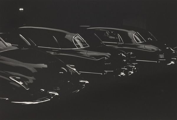 Editor: This gelatin-silver print, "Headlight," was captured by Robert Frank sometime between 1958 and 1960. It’s striking how Frank transforms a mundane subject into something so… textural. What draws your eye in this piece? Curator: The composition directs my attention immediately to the interplay of light and shadow. Note how the tonality, transitioning from the darkest blacks to almost pure whites, creates a dynamism independent of the subject matter. Frank masterfully manipulates grayscale to highlight the material quality of the metal, almost rendering it palpable. Observe also the reflected cityscape contained within the headlight. Editor: So you see the form itself as the most significant aspect? The cityscape almost feels secondary to me. Curator: Not secondary, precisely, but integrated. The reflected image, while representational, is functionally part of the textural schema. It creates another layer of visual information, another facet of the photograph’s overall structure. Does that not enhance the image? Consider the implications of disrupting this relationship. Editor: I suppose so. The composition is compelling in that way. Without the reflection, it's just a picture of a headlight. Curator: Precisely. This detail transforms it, elevates it, through visual complexity and the clever balancing of pure form against pure representation. Are you perhaps beginning to appreciate the effect now? Editor: I think so. It’s like Frank uses the world outside to define the world within the frame. It definitely gives me a different perspective on how to view photographic still lifes. Curator: And hopefully, a fresh lens through which to examine the structure inherent in art.