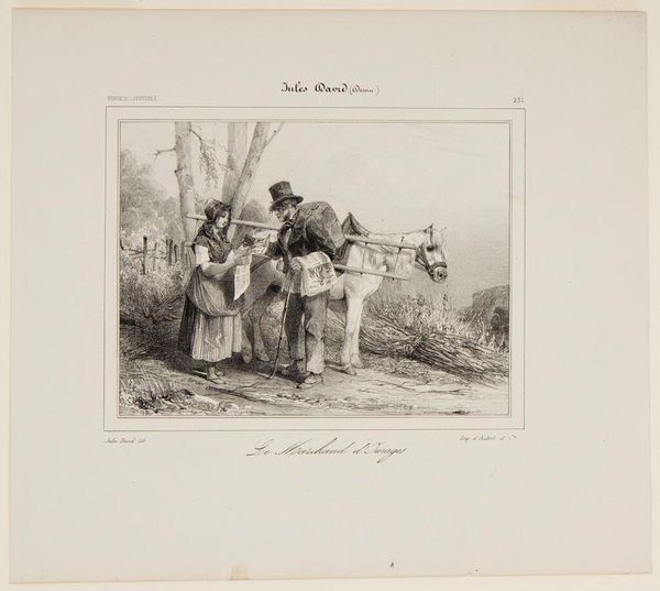 Editor: Roqueplan’s print, "Le Rendez-vous," depicts a meeting of figures in a landscape. There's a certain formality mixed with the casual setting that strikes me. What symbols or cultural meanings do you see embedded in this work? Curator: Notice how the central figure gestures outward, eyes scanning the horizon. He embodies expectation. The dogs, symbols of loyalty and vigilance, mirror this anticipation. Perhaps this gathering represents a cultural ritual or social expectation, a symbolic intersection of individual desires and collective destiny? Editor: So the meeting itself becomes a symbol? Curator: Precisely. The rendez-vous, a designated place and time, suggests the importance of social bonds, the choreography of human connection, and the weight of unspoken promises. What will this "meeting" bring? Editor: It's fascinating how much meaning can be layered into such a seemingly simple scene. Thanks! Curator: Indeed. Symbols are never truly simple; they are echoes of our shared past, shaping how we understand the present.