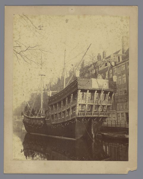 Curator: Looking at this, the overwhelming sense is one of industry and maritime power. The towering ships almost dwarf the viewer. Editor: This is “Gezicht op Bremerhaven,” or “View of Bremerhaven,” a gelatin-silver print, possibly taken between 1853 and 1900, by Louis Koch. Note the compositional strength—how the ships frame the harbor basin. I wonder what this port meant for immigration. Curator: Those are immigrant ships! This connects so many different levels of global and local material culture. From the shipbuilders in the docks, to the photographers and the printmakers creating these souvenir views for travelers… I can’t help but consider the manual labor that went into constructing and maintaining these vessels. Editor: Exactly. This was a critical port for emigration to the Americas, which raises questions about global economics and demographics. And pictorially, consider how the gelatin-silver process allowed for crisp detail and tonal range. Curator: The technology is the message. It shows these new massive ships against the industrial might of Bremen’s trading past and the future diaspora of a continent’s migration west. But there's the less obvious stuff to be pondered too - how does the composition manipulate perspective? Editor: Well, the symmetrical framing creates a visual gateway—an invitation and an exit at once. This aesthetic choice underscores Bremerhaven’s historical function as a threshold between the old world and the new. Curator: It certainly highlights the transformation in shipping and, of course, photographic processes during this period. Thinking about it reminds me of other artists depicting similar maritime scenes with different goals and materials - completely recontextualizing the social dynamic! Editor: Precisely, and that contextual approach emphasizes the multilayered implications that transcend purely aesthetic considerations. So powerful, isn’t it? Curator: It is that—food for thought indeed.