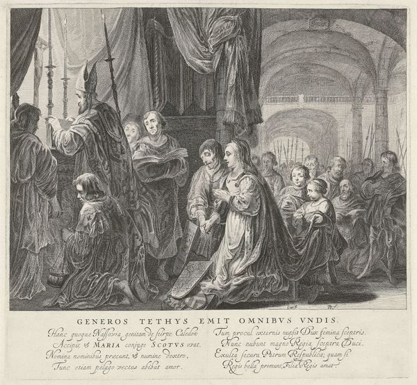 Pieter Nolpe created this engraving titled "Tableau vivant met het huwelijk van Reinald II van Gelre en Eleonora van Engeland in 1332," sometime in the 17th century. The composition divides the scene into distinct spatial zones through Nolpe's masterful use of hatching and cross-hatching to model forms and create depth. The eye is drawn to the central figures of Reinald and Eleonora, framed by the cleric and witnesses. Nolpe destabilizes our understanding of space, and the architecture seems to compress the scene, pushing the background figures closer to the foreground. The semiotic system at play is fascinating. The figures, with their gestures and expressions, act as signs that converge to signify the cultural codes of marriage, power, and lineage. The spears and onlookers challenge any fixed meaning, reflecting broader artistic and philosophical concerns about representation and the construction of historical narratives. The image functions as a cultural artifact deeply embedded in the socio-political discourse of its time.