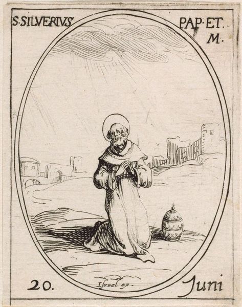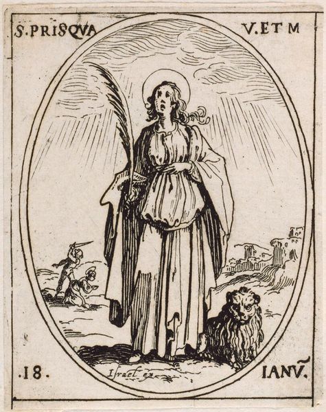 Editor: This is Jacques Callot's "Saint Tatiana", a rather small etching. There's something quite vulnerable about this saint, kneeling between a bear and a roaring lion. What do you make of this scene? Curator: Well, look closer at the lines, almost vibrating with energy, even in miniature. The saint's halo is faint, yet persistent, like her faith. Maybe Callot invites us to find strength not in grand gestures, but quiet resilience against chaos? Editor: So, it's less about the literal danger, and more about the internal fortitude? Curator: Precisely! It's an intimate drama, wouldn't you say? A quiet moment of defiance, etched in faith. Editor: That gives me a new appreciation for its delicate nature. Thank you!