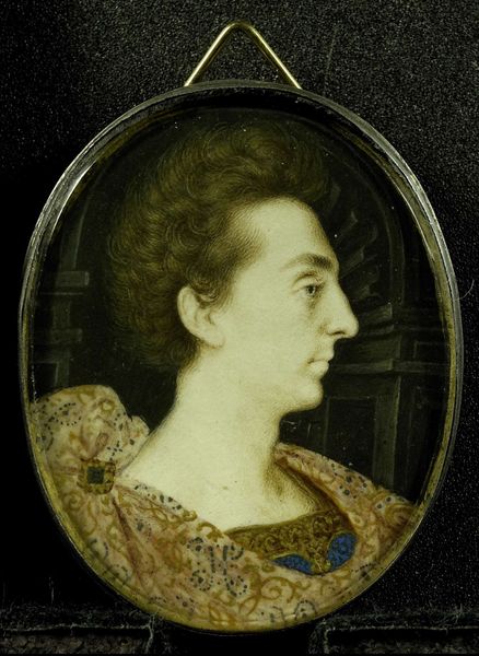 Peter Oliver painted this miniature portrait of Karel Stuart, later King Charles I of England, using watercolors on vellum. The tiny scale and jewel-like quality speak to the rarefied world it inhabited. This wasn't painting for public consumption, but an intimate token, likely for the sitter himself or a close associate. The colours, though muted now, would have been vivid, achieved by layering translucent washes of pigment. The fine details, like the lace collar and the gold embroidery, highlight Oliver's skill and the luxury of the court. Consider the labour involved here. The vellum had to be carefully prepared, the pigments ground, and the details meticulously applied with tiny brushes. The precious metal frame adds to the effect of exclusivity and wealth, reminding us of the social distance between the king and his subjects. Ultimately, this miniature is a testament to the power of materials and processes to convey not just likeness, but also social and political meaning.