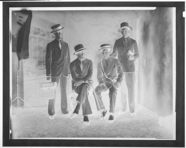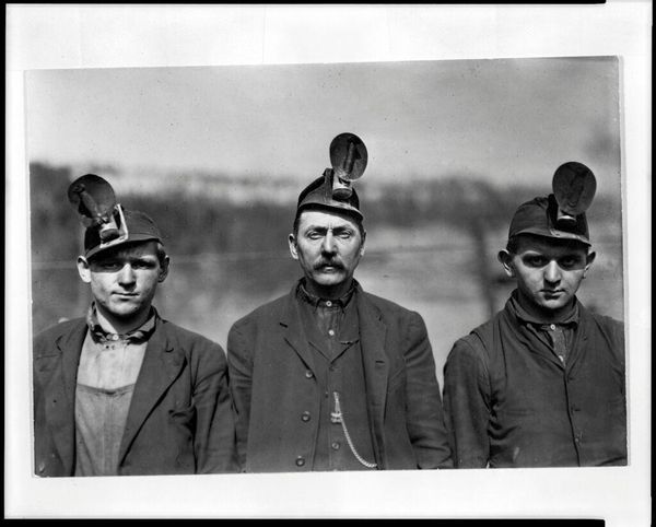 Editor: This is an untitled photograph, "group of men," by Lewis Hine. The grayscale and the men's clothing give a historical feel. What strikes you most about this piece? Curator: I immediately consider the means of production: Hine's photography was instrumental in documenting labor practices. How did the accessibility of photography at the time shape social reform? Editor: I hadn't considered the impact of photography itself as a tool! So, the photograph captures the reality of labor conditions at the time? Curator: Precisely. It shows how images could be consumed to affect social change. These men's clothes, their expressions – what do they tell us about their labor and social standing? Editor: Their clothes seem worn, and their expressions are serious. It gives a sense of the working class experience and how that was captured and distributed. Curator: Exactly. And by focusing on that materiality, we gain insight into the social and economic realities of the time. It's not just art, it's evidence.