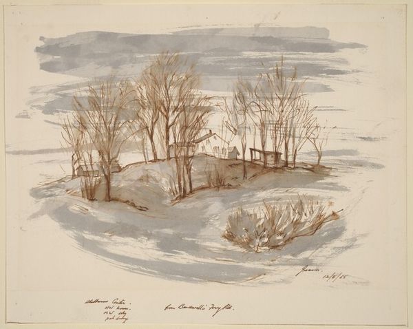 Curator: Donald Carlisle Greason's "Snowscape" from 1961 presents a quiet scene using ink and watercolor in a plein-air approach. What strikes you first? Editor: There's a serene simplicity. It feels almost monastic with its limited color palette and the sparseness of the composition. The landscape seems heavy with silence. Curator: It’s fascinating how Greason utilized such rudimentary materials to evoke such a strong sense of place and atmosphere. His process highlights the interplay between observation, skill, and readily accessible resources, bridging fine art and what we might consider the everyday act of sketching outdoors. Editor: Indeed. The very act of painting en plein air connects to broader societal values—the pursuit of leisure, the appreciation of nature. However, these seemingly apolitical scenes were rarely, if ever, fully accessible to all during the Civil Rights era. Who had the time, the resources, to simply observe? Curator: The drawing is rendered mostly in earth tones which enhances its feeling of realism. It shows a directness in its making—almost as if it was a rapid capturing of the immediate environment, blurring the lines between finished artwork and a preparatory study. Editor: This is true, but even in that "realistic" portrayal, the historical lens asks us to consider the narrative absences—Whose gaze is privileged here? Whose stories are absent from this snowy field? Were those buildings vacation homes, farm dwellings, or something else? And who were the possible inhabitants who did not benefit from leisurely observation? Curator: The medium allows for the delicate portrayal of light on snow. It's the perfect medium to convey that kind of transient experience. I like to imagine the physical setting, the artist balancing paper and paint, with an urgency to get down the image. Editor: Agreed, but let's remember to see art as more than the individual act. Landscape imagery, as seemingly innocuous as this one appears, is intrinsically connected to broader issues of land ownership, labor, and social access. By critically evaluating how landscape is presented, we come to new questions and narratives. Curator: I appreciate the added social perspective, while I keep admiring the way Greason let his chosen mediums speak for themselves. There's a certain transparency to his method, reflecting perhaps, the stark, straightforward beauty of the scene itself. Editor: And perhaps, this stark beauty should also reflect stark realities—a place to appreciate aesthetic achievements while remembering and researching historical inequalities.