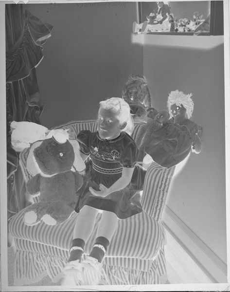 Editor: This untitled photograph by Lucian and Mary Brown shows a woman and two girls on a couch. It has a very dreamlike, almost ghostly quality to it. What symbolic meanings can be found in this kind of domestic scene? Curator: The family unit has long been represented with potent symbolism. Think about how the floral patterns on the couch might recall themes of growth, nurturing, or the fleeting nature of life, all central to the family experience. What emotions does this imagery evoke in you? Editor: It makes me consider memory, and how it changes over time. Curator: Precisely. This image may have been intended to celebrate family ties, but it also serves as a symbol of shared history and enduring connection across generations. Editor: Thank you; I hadn’t thought about the floral pattern that way. Curator: Exploring these photographic portraits helps us to rethink how our collective memories are recorded and interpreted.