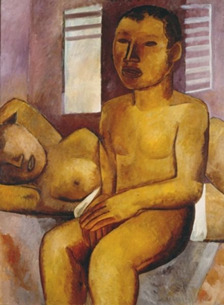 Editor: This is Alice Neel's "Ethel Ashton," an oil painting created in 1930, and currently residing at the Tate Modern. The directness of the gaze, combined with the somewhat unconventional representation of the figure, makes it quite a striking portrait. How do you interpret the compositional choices here? Curator: Focusing on the formal elements, the most compelling aspect of this work lies in its calculated distortion. Note how the artist employs an almost brutal honesty in her depiction. Observe, in particular, the lines defining the subject's form – they are neither softened nor idealized, but rather rendered with unflinching candor. How do you feel that choice impacts the viewer's perception? Editor: It does make you confront the subject more directly, perhaps stripping away a layer of artifice we're accustomed to in portraits. Curator: Precisely. The interplay between the stark realism of the figure and the almost abstract patterns in the background also deserves scrutiny. The contrast between the organic and the geometric adds a certain tension. It invites questions about the relationship between figure and ground, and the ways in which our perception of the human form is influenced by its surrounding environment. The expressiveness in her color usage evokes emotional response in the audience as well, doesn't it? Editor: It does. It’s interesting to see how focusing on these formal elements really shifts my understanding from just seeing a nude to analyzing the specific artistic decisions. Curator: Indeed. And, of course, formalism allows the exploration of these choices in conjunction with the art's place in history as well as potential meaning derived from such historical study. What begins with form never really stops there.