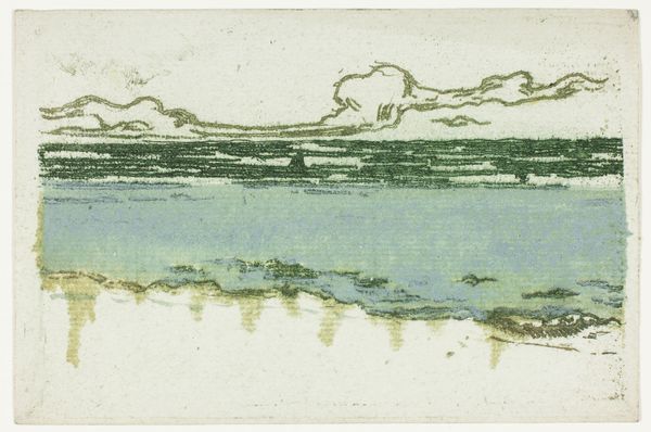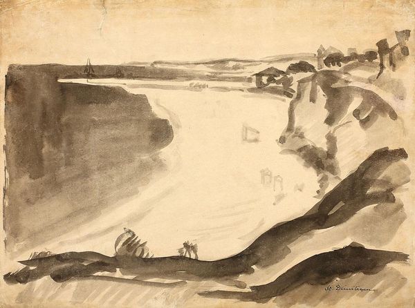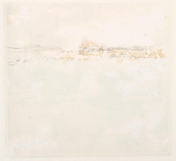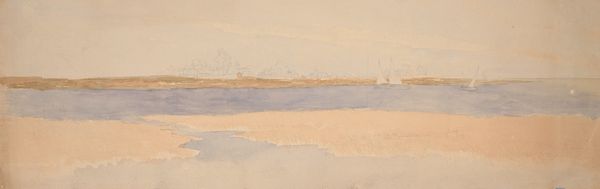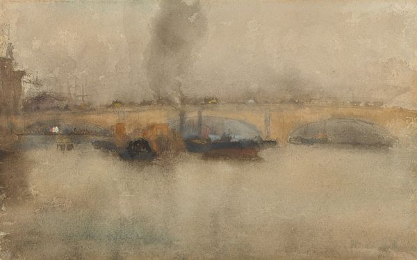Curator: We're looking at John Marin's "River Scene, Weehawken, New Jersey," a watercolor painted around 1911. Editor: My initial reaction is one of sparseness. The delicate washes of watercolor create a sense of atmospheric emptiness, a kind of hazy quiet over the industrial scene. Curator: Exactly. The visible brushstrokes and thin washes allow the white of the paper to assert itself, playing a crucial role in the overall composition. The abstraction flattens the picture plane, minimizing any illusionistic depth. Editor: Yes, and look at the almost casual application of the pigment. The materiality of watercolor is front and center here; the artist is clearly embracing its fluid, translucent qualities. This reminds me of the history of labor involved in pigment production - think of grinding minerals and extracting dyes - and then see it distilled down to these economical marks, it's quite remarkable. Curator: The limited palette enhances this effect. Note the restrained use of blues, yellows, and browns; the relationships between them generate the tonal nuances and define form. It creates a visual poem based on subtle variation and compositional balance. Editor: I find that compelling, the artist has created depth within an industrial landscape, seemingly inviting the viewer to engage with industry as natural form, challenging the dichotomy between nature and labor. This scene doesn't offer a clear sense of space or place. Curator: Perhaps Marin is aiming for more of an emotional impact, rather than objective depiction. I read the expressive brushwork as a conscious attempt to evoke a particular mood and moment, which serves as a metaphor for the modern human experience within that place. Editor: A very different take than my own. Regardless, Marin encourages us to acknowledge that our environments, natural or constructed, are not always self-evident. Thanks for your insights! Curator: Likewise, an engaging material perspective; thank you!