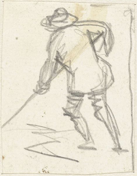 Simon Andreas Krausz made this drawing, Jagertje, with graphite. Krausz, born in the mid-18th century, lived in a society undergoing significant transformation. The Enlightenment ideals of reason and individualism were challenging traditional social hierarchies, influencing art and culture. This sketch depicts a hunter, or "Jager," a figure often romanticized in art and literature. But who were these hunters? Were they landed gentry engaging in leisure, or were they individuals tasked with providing for their families? Krausz captures a figure in motion, with the suggestion of labor and movement that stands in stark contrast to static aristocratic portraiture. There is a tension in the image between the hunter's potential freedom in nature and the constraints of his societal role. As you look at Jagertje, consider how Krausz uses the simplicity of line to suggest a complex interplay between identity, labor, and the natural world.