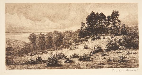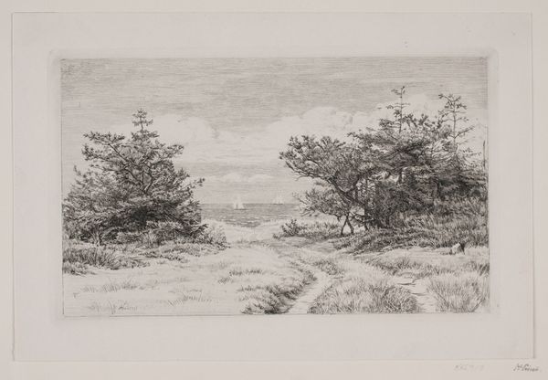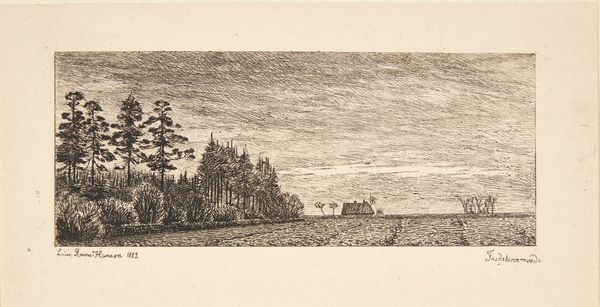 Editor: This is Louise Ravn-Hansen's "Fredskovsminde," an etching from 1882, held at the SMK. It strikes me as quite austere, almost melancholy, with that lone building on the horizon. How do you interpret the social context of a landscape like this at that time? Curator: That’s a great initial reading. I see it as a statement on land use and societal values of late 19th-century Denmark. Consider the Realist movement, the focus was on depicting the world as it truly was. Landscapes weren't just pretty pictures, they were reflections of human interaction with nature, ownership, and agriculture. Editor: So, the simple rendering of the house suggests something about the people living there? Curator: Exactly. Ask yourself: What does the prominence of the forest on the left suggest about resources or traditional ways of life perhaps being preserved? Or does the expanse of the cleared, tilled land in the foreground indicate changes, maybe industrialization, that are impacting society's relationship to nature? Editor: It’s a far cry from the romantic landscapes we’ve studied. Much less idealized. More… documentary. Curator: Indeed. Ravn-Hansen gives us what is there – the economic and the social implications present in that landscape. Editor: The print medium itself, does that affect the piece’s social function at the time? It’s easily reproducible, making art more accessible. Curator: Good point. The democratization of art was on the rise, so prints made artwork accessible to middle-class audiences who wanted to learn more about landscape and nationhood. Think about how these images contribute to shaping the national identity. Editor: I never thought about a landscape doing that! This has completely shifted my understanding of Realist landscape art. Thanks. Curator: And thank you for your insightful questions; considering prints this way illuminates their important role in circulating ideas.