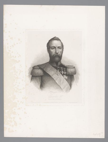 Editor: This is "Portret van Willem, prins der Nederlanden," an engraving made sometime between 1865 and 1949 and currently at the Rijksmuseum. It strikes me how detailed the engraving is, especially the Prince’s uniform. What stands out to you in this print? Curator: The material process here is key. Engraving, particularly in the 19th century, was tied to mass production and dissemination of images. It's not just about depicting the Prince, but also about accessibility. Who was meant to see this image, and how does that affect our understanding of its message? Consider the labor involved: the engraver’s skill translating likeness into reproducible lines. How does that skilled labor, and the social position of the engraver, speak to ideas about class and artistic production at the time? Editor: So, it's less about the Prince himself and more about how his image was consumed? Curator: Exactly. Think about the paper it's printed on, the ink used. These materials weren't neutral; they had a value and were part of a wider economic system. The act of reproducing this image brings the power dynamics of royalty and the material conditions of 19th-century printmaking to light. Editor: I never considered the choice of engraving as being inherently linked to a system of production. Thanks! Curator: Understanding the "how" and "why" of its making illuminates so much more than simply the "what" being depicted. It challenges that traditional art-historical focus on individual genius. Editor: Right. It definitely gives me a new appreciation for prints and the often-overlooked craft behind them.