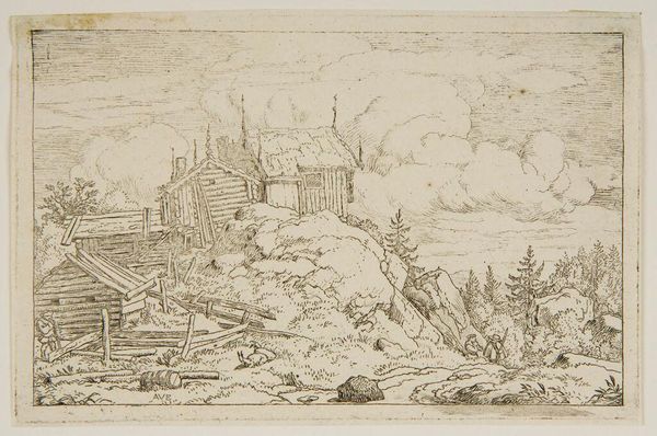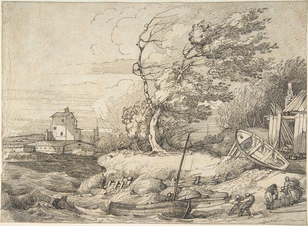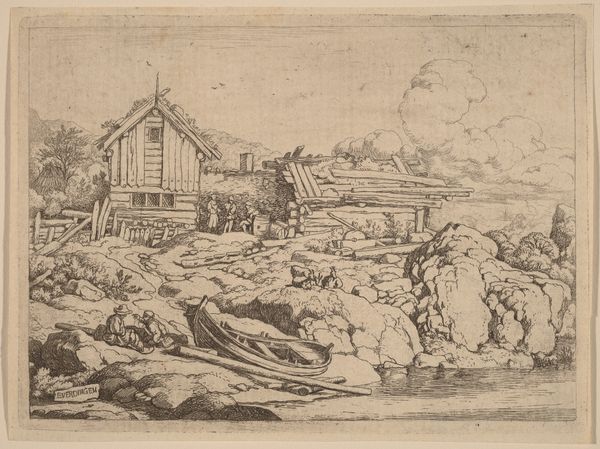 Editor: So, this is Allart van Everdingen's etching, "Row-boat Drawn up on the Shore." It's incredibly detailed. What strikes me most is the contrast between the still boat and what seems like a gathering of people. What do you see in this piece? Curator: I see a staged encounter between nature and community. How might Everdingen be reflecting on resource distribution? The labor implied in the landscape—lumber, fishing—and the people possibly convening around these resources. Is this a scene of idyllic harmony, or does it hint at social tensions? Editor: That's interesting. I hadn't considered the social dynamic, only the visual narrative. Curator: Exactly. The beauty masks a potential commentary on access and labor. It makes you wonder, doesn’t it, whose work sustains this scene and who benefits? Editor: Definitely gives me a lot to think about. Thanks for pointing that out!