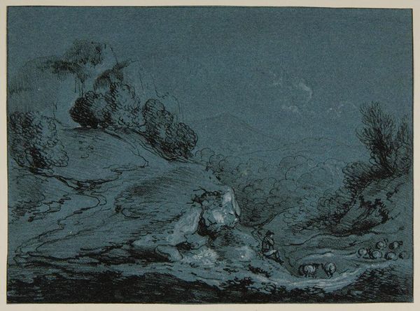 Curator: This is "Landscape", a drawing attributed to Thomas Gainsborough, dating somewhere between 1750 and 1899. It resides here at The Metropolitan Museum of Art. Editor: It’s incredibly evocative! A very subdued and quiet composition in pencil; immediately I am drawn into a dreamy sort of vista. Curator: Dreamy is right. Gainsborough's handling of pencil here elevates what might be considered a sketch into something far more atmospheric. Consider the layers—the visible chalky foundation onto which the trees and figures are added, almost as afterthoughts. How does this relate to Gainsborough's engagement with social change? Editor: Well, we see a departure from idealized landscapes and more of a focus on rural life; that small group tending livestock grounds us. Gainsborough, born into a family involved in the cloth trade, may be using landscape to explore the raw materials, if you will, of rural existence. Was this work commissioned? It feels so immediate. Curator: Unfortunately, provenance details are scant, so pinpointing the social circumstances is difficult. However, consider the broader cultural appetite for these types of scenes. These weren't mere topographic studies but actively engaged with notions of pastoralism, romanticizing agricultural life. Editor: The hazy almost industrial quality really intrigues me too. Perhaps in an odd way hinting at urbanization from a distance by use of what some might term dirtier material of pencil/chalk drawing as opposed to a cleaner landscape painting using oil paints. Curator: Fascinating to note the choice of medium in contrast to traditional oil paintings and to point towards industrial influence through such drawing choices! Something so readily available democratizes artistic experience for artist and viewer alike. Editor: Indeed! And, as an experience, what’s fascinating to me is how a seemingly simple medium, employed in a seemingly uncomplicated manner, presents a rather potent tableau about changing times. Curator: Ultimately, "Landscape," compels us to think critically about not only the scene before us, but its potential social and historical implications during the time.