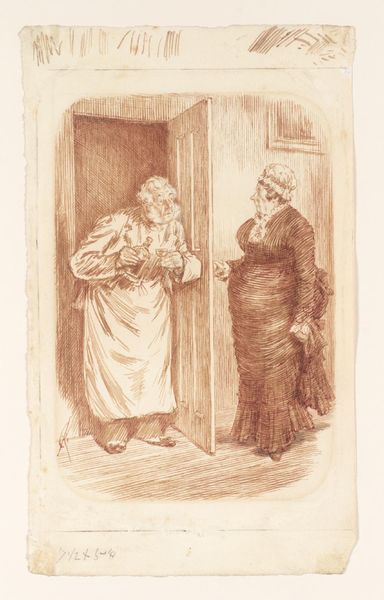 Théophile Alexandre Steinlen rendered this drawing with pastel and crayon, its textured surface creating a study of contrast, primarily through shape and colour. We see two figures placed within a confined interior, where the older man seated on the left and the youthful woman standing on the right are brought together by an interplay of light and shadow. The composition guides our eye in how the figures are positioned. The woman, with her vibrant clothing, stands in sharp contrast to the man whose muted clothing is rendered with softer lines to show his age. The diagonal lines lead us from the darkness in the upper left, down to the brighter, illuminated portions of the woman’s clothing and the floor. Consider how Steinlen uses a structured composition to challenge the viewer’s perception. The use of perspective and the juxtaposition of youth and age provoke reflection on social and cultural values. The work resists simple interpretation, inviting us to consider the complexities inherent in human relationships.