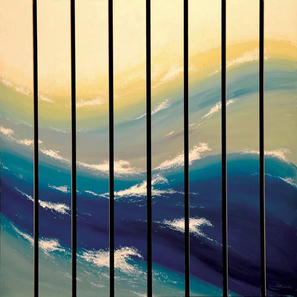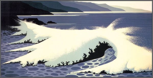 Eyvind Earle created this arresting image, "A Sounding of Surf," with serigraphic paint to capture the awe-inspiring power of the ocean. Here, color and line converge, and a monochromatic palette is used to dramatic effect, the gradation of blues offering a perspective that leads the eye from the foreground wave to the distant, muted horizon. The structure is built upon contrasts, not only between the dark, turbulent waters below and the cresting white wave, but also in the texture. The foam is almost explosive, a textural contrast to the tranquil sea beyond. Earle masterfully orchestrates depth using the interplay of color and the simplified forms of the landscape. He destabilizes traditional landscape painting with a sharp focus on surface and pattern. This is no mere representation of nature, but an active engagement with the visual structures that constitute our perception of it. The wave becomes a symbol, its formal qualities resonating far beyond the depiction of a seascape.