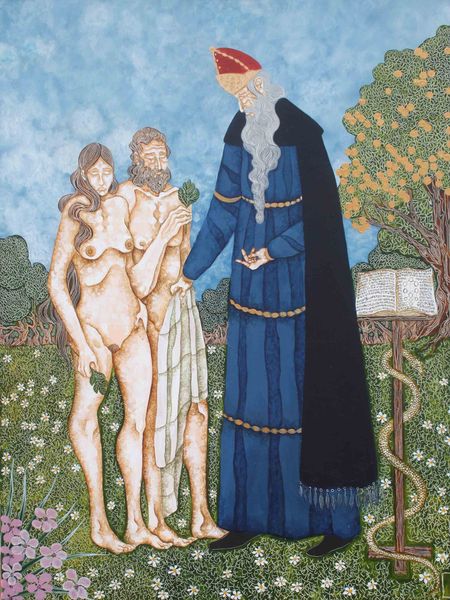 Curator: What strikes me immediately is the pervasive sense of supplication. The figure kneeling is just so completely open, literally and metaphorically, to whatever is coming her way. Editor: Indeed. What we have here is a painting by John Duncan called, 'According to Your Faith Be It Unto You.' It has some symbolic landscapes too. Curator: That title certainly colors the experience! There's such a strong connection between belief and perception. This image feels less about divine power and more about the power of suggestion and internalized faith. I can imagine the materials used amplify this atmosphere too; what’s been used here? Editor: I believe we are seeing gouache and watercolor here. Both invite translucency, blending, almost an ethereal quality—perhaps the artist favored these malleable media precisely to evoke such inner worlds. And looking closer, the labor involved to create such smooth gradients of color cannot be overstated. It required hours to realize the forms. Curator: It feels intimate. Not loud or didactic, but quiet and internal. Are we witnessing a moment of blessing or… something more psychological? Is that kneeling woman being offered a gift, or being molded by her own expectations? Editor: It is tempting to ponder what role gender and labour might have played in the scene of blessing shown here. I can almost feel the tension in her fingers! What strikes me is the figure’s white robes; such painstaking rendering implies time spent. I find that very fascinating when considering its theme around beliefs. Curator: The more I look, the more dreamlike it seems. And dreams, of course, are just projections of our inner lives, painted with the colors of our hopes and fears. Editor: That’s a very generous reading. What are your parting thoughts? Curator: I like its openness. It invites me to project my own narratives, to kneel alongside that woman, and to wonder what it is that I truly believe. And how those beliefs might be shaping my world. Editor: And for me, it’s that dedication of time, that investment of hours into crafting something so seemingly simple, that makes me consider just how valued art, or belief for that matter, should be in the grand scheme of things.