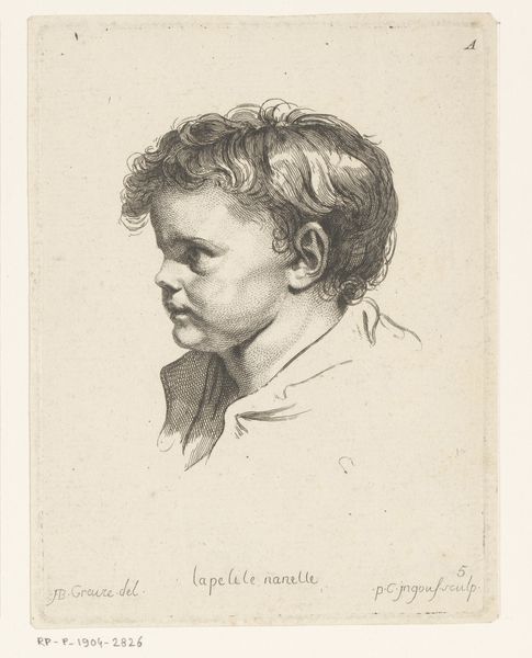 Curator: Here we have "E. O. Mygind," a drawing dating from 1820 to 1906 and currently residing here at the SMK. It’s a charming figural portrait. What’s your first take on it? Editor: Initially, there’s an almost unnerving innocence to this child's gaze, rendered starkly through what looks like pencil and print work. There’s a compelling contrast between that perceived naivety and the technical skill evident in its crafting. Curator: Exactly. Consider how prints and drawings like this were produced, usually for mass dissemination. The availability speaks to societal shifts regarding the access to portraits during this time. Was art for the elite only? Were things changing? What’s your read on the potential impact this availability could have had? Editor: Absolutely. In considering that context, one could consider what impact these relatively widely available likenesses had in a world that was not yet saturated with photographic portraiture. Perhaps this type of easily reproduced artwork enabled greater social visibility for the sitter, suggesting power dynamics at play, perhaps an act of elevating the sitters perceived social importance via portrait dissemination. The context in which this was made accessible challenges typical elitist consumption. Curator: And the materials themselves – pencil and print - point to the increasing professionalization and commodification of art production. Unlike paintings which, although sometimes produced via workshops, often speak more of individual patronage and artisanal making, a drawing intended as a print speaks directly of multiples. It democratizes portraiture, yet it retains a trace of the handmade, as someone first made the drawing from which the print was made. What tensions does it represent? Editor: Indeed. The drawing holds the seed of artistic expression before it morphs through mechanical reproduction for wider availability. This interplay between individual artistry and mass-produced likeness provokes crucial discussions. I wonder: does increased accessibility diminish the perception of value or make its statements bolder? Is there a message about emerging consumer culture here? Curator: The act of reproduction invites speculation about the art market of that era and today: questions of rarity, accessibility, and how artistic value is determined continue to have significance now. It's fascinating how a simple drawing can raise so many issues. Editor: Ultimately, this piece facilitates a crucial dialogue concerning the intersection of representation, cultural production, and emerging modern societal structure during this time period. This print provides the space to re-evaluate established boundaries of artistic hierarchy while interrogating how such notions are both imposed and destabilized over time.